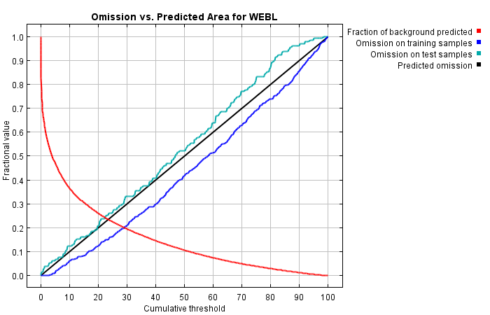 | Cumulative threshold | Description | Fractional predicted area | Training omission rate | Test omission rate | P-value |
